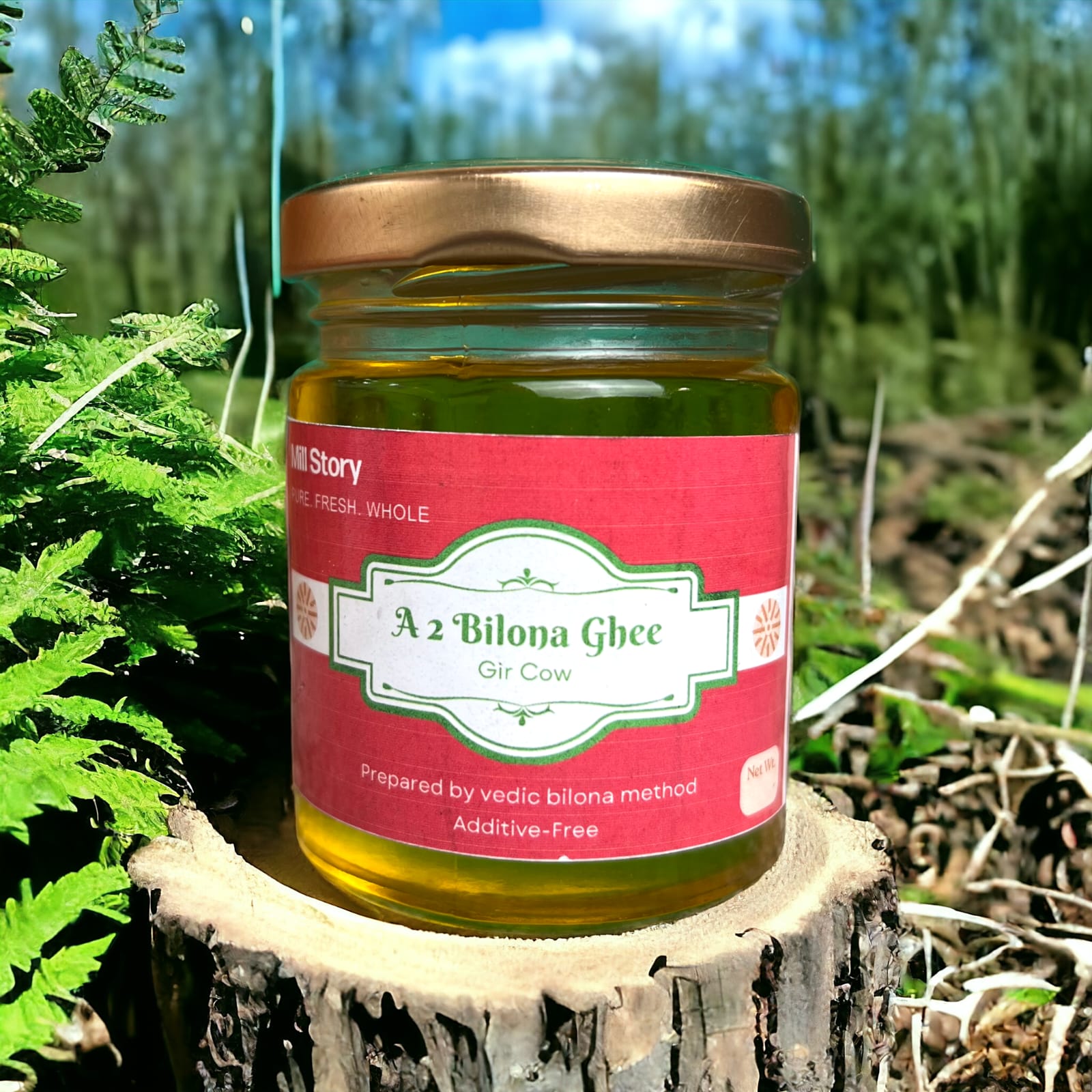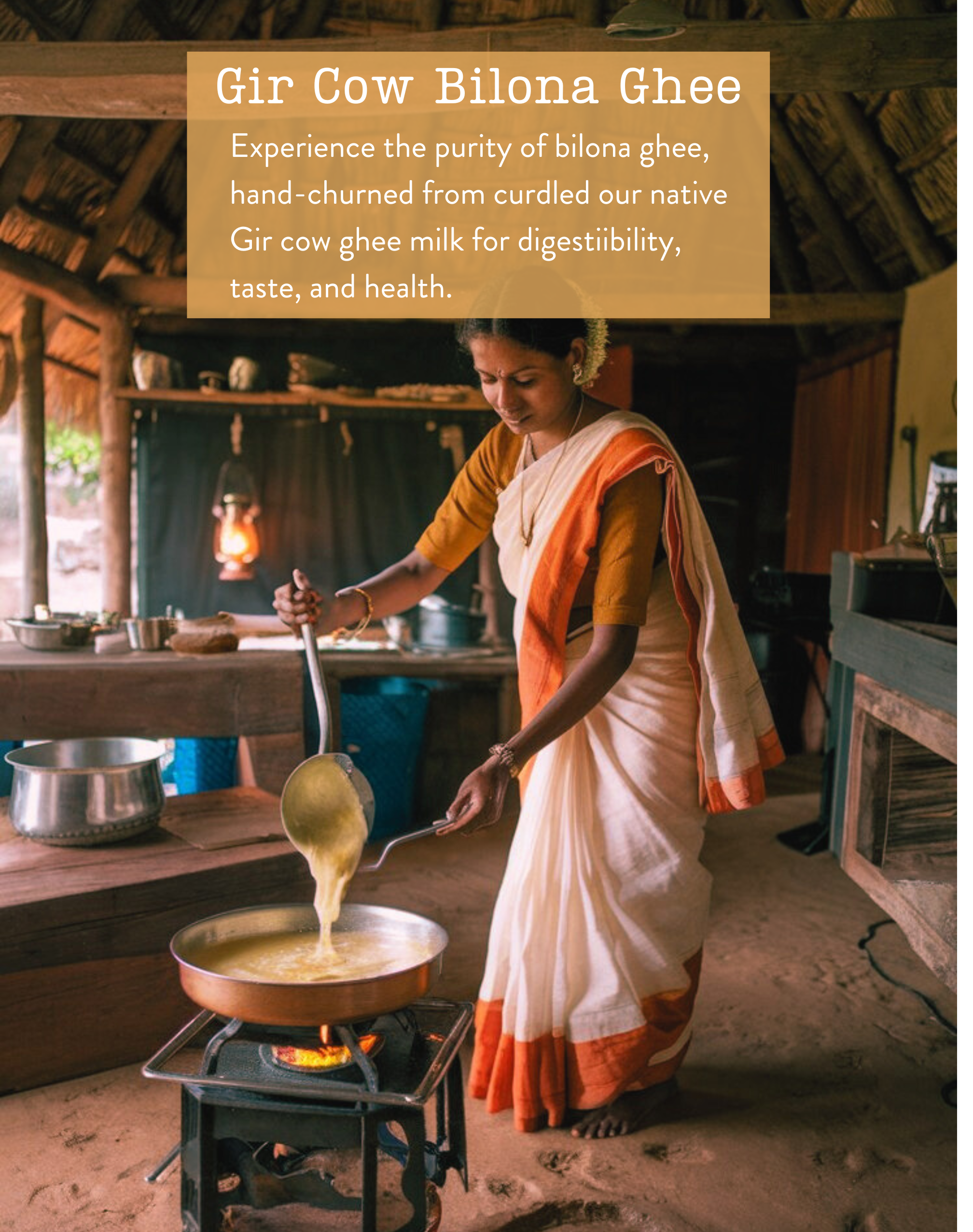 Experience the purity of Bilona Ghee, hand-churned from curdled Gir cow milk (A2) for digestibility, taste, and health